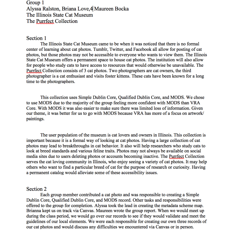 Part of working on the metadata schema report involved working with two other students that I did not have a deep relationship with. Part of working with a group is to figure out how to put differences aside to get the job done. This was accomplished by delegating tasks that played to the strengths of the group members. Plus, I ended up being the mediator and would keep the group on track while we were working in tandem on certain aspects of the project.